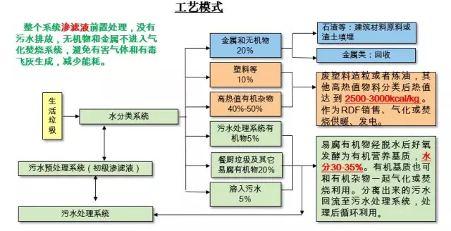 以自有研發(fā)的垃圾水分類(lèi)技術(shù)為核心和前提,結(jié)合并優(yōu)化現(xiàn)有垃圾分類(lèi)方法、資源再生技術(shù)的垃圾處理方法,整個(gè)系統(tǒng)滲濾液前置處理,沒(méi)有污水排放,無(wú)機(jī)物和金屬不進(jìn)入氣化焚燒系統(tǒng),避免有害氣體和有毒飛灰生成,減少能耗。以其恩施項(xiàng)目為典型案例,對(duì)其具有自主專利的垃圾水分類(lèi)技術(shù)進(jìn)行了全面的介紹,具有綜合利用率80%以上,無(wú)二次污染,清洗水全部經(jīng)處理回用,氣化燃?xì)夂蜔煔馀欧胚_(dá)標(biāo)無(wú)隱患等技術(shù)特點(diǎn)。