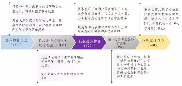 1991年頒布的《包裝廢棄物法》將包裝廢棄物的收集和處理責(zé)任從過去的各個(gè)行政州政府分?jǐn)偨o了各生產(chǎn)廠家、分銷商等企業(yè)機(jī)構(gòu),要求生產(chǎn)廠家和分銷商回收其產(chǎn)品包裝,并進(jìn)行再利用,該法催生了德國著名的“二元回收系統(tǒng)”(即“綠點(diǎn)公司”),與公共環(huán)衛(wèi)回收系統(tǒng)平行運(yùn)作。