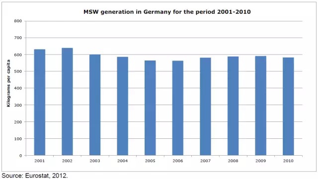 根據(jù)歐洲統(tǒng)計(jì)局的數(shù)據(jù),從2001年至2010年,德國的城市生活垃圾總產(chǎn)生量在5000萬噸左右浮動(dòng),但是人均垃圾產(chǎn)生量有所下降,從2001年的632kg/a(1.73kg/d)減少到2006年的564kg/a(1.55kg/d)。