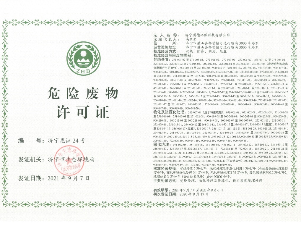 9月10日,雅居樂環(huán)保集團(tuán)旗下濟(jì)寧明德環(huán)??萍加邢薰?以下簡稱“濟(jì)寧明德項目”)喜獲濟(jì)寧市生態(tài)環(huán)境局頒發(fā)的5年期《危險廢物許可證》。這也是當(dāng)?shù)貎H有的兩張5年期《危險廢物許可證》之一。