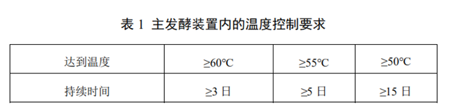 c)主發(fā)酵裝置內的溫度及持續(xù)時間應滿足表1的要求。采用密閉式堆肥反應器時,宜在反應器中心與距反應器內壁100 mm處各設2個測溫點,溫度按測溫點均值計,溫度需連續(xù)記錄。采用半密閉式和敞開條垛或槽式堆肥時,宜在條垛或槽式堆肥的長度方向每間隔5m橫截面的中心與距表面和底部100 mm處各設1個測溫點,溫度按測溫點均值計,間隔2小時記錄溫度1次。