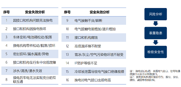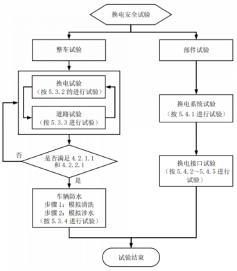 《要求》包括安全要求、試驗(yàn)方法及檢驗(yàn)規(guī)則,其中安全要求涉及一般要求、整車(chē)要求和部件要求,分別規(guī)定了5000次(卡扣式)和1500次(螺栓式)的最低換電次數(shù)要求。換電安全試驗(yàn)流程如下: