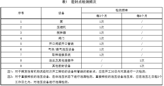 氣體、輕液接觸或流經的密封點檢測頻次最低應符合企業(yè)所屬行業(yè)標準規(guī)定的檢測頻次,所屬行業(yè)未發(fā)布標準,執(zhí)行表1的檢測頻次。