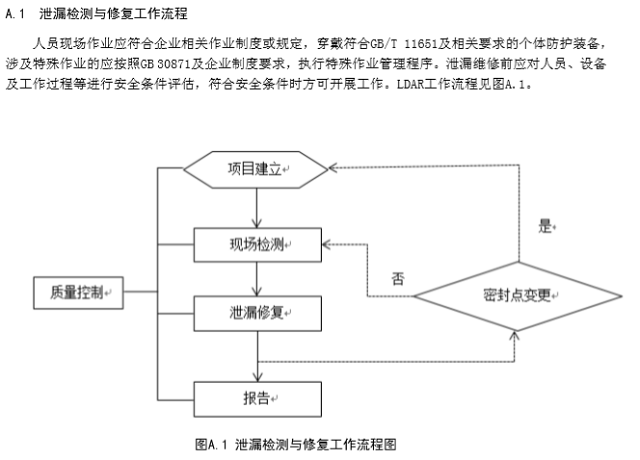 LDAR工作流程包括項目建立(資料收集、密封點識別、密封點檔案建立)、現場檢測和泄漏修復等 步驟。若企業(yè)因開停工、檢維修以及改擴建等原因發(fā)生密封點變更的,需重新建立密封點檔案后開展現 場檢測和泄漏修復工作。LDAR工作流程按照附錄A進行。