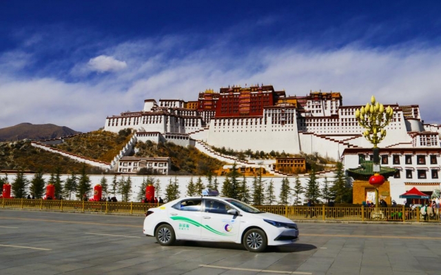 新能源出租車(chē)從布達(dá)拉宮廣場(chǎng)前駛過(guò)(2018年2月11日攝)。 新華社發(fā) 央梅朵 攝