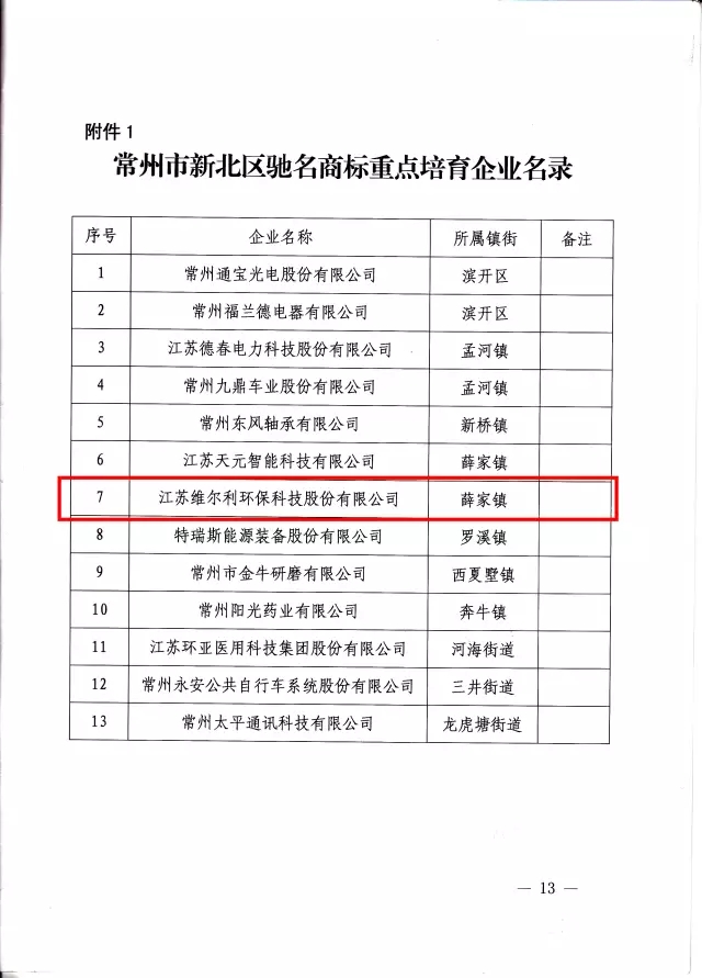 在《常州市新北區(qū)黨政辦公室關于印發(fā)常州市新北區(qū)深化商標品牌戰(zhàn)略行動計劃(2017-2019)的通知》(常新委辦〔2017〕111號)文件中,提出深化商標品牌戰(zhàn)略建設,將維爾利環(huán)保作為常州市新北區(qū)馳名商標重點培育企業(yè),實施“產(chǎn)業(yè)品牌提升”工程,打響產(chǎn)業(yè)品牌特色優(yōu)勢,培育細分行業(yè)新品牌。