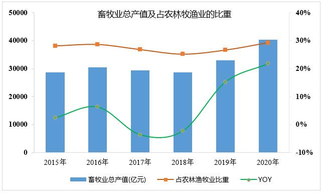 隨著生活水平的提高,人民對畜禽產(chǎn)品的需求不斷提升,進而促進了畜牧業(yè)的發(fā)展。根據(jù)國家統(tǒng)計局數(shù)據(jù)顯示,全國畜牧業(yè)總產(chǎn)值從2015年28649億元發(fā)展到2020年的40266億元,經(jīng)過一定時期的增長,2020年畜牧業(yè)迎來歷史新高。畜牧業(yè)占農(nóng)林牧漁業(yè)總產(chǎn)值比重維持在25%~30%,已經(jīng)成為其支柱產(chǎn)業(yè)。畜牧業(yè)的快速發(fā)展對農(nóng)民的增收、農(nóng)村經(jīng)濟的發(fā)展做出了重大貢獻。