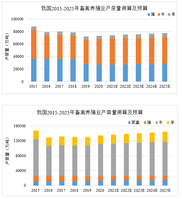 2019年,我國生豬市場受到“豬瘟”疫情影響,出欄量大幅下降。2020年受到新冠疫情全球化及進出口貿(mào)易局勢影響,豬牛羊肉等市場預(yù)期有所恢復(fù)但增速不敵疫情前預(yù)期,畜牧行業(yè)整體受到一定影響,低谷期有所延長,預(yù)計三年內(nèi)市場將恢復(fù)平穩(wěn)。根據(jù)公開數(shù)據(jù)推算,我國畜禽養(yǎng)殖業(yè)主要類別禽畜產(chǎn)糞量將在10億噸左右,產(chǎn)尿量逾7億噸。