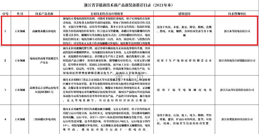 近日,浙江永發(fā)機(jī)電有限公司(下稱“永發(fā)機(jī)電”)作為電機(jī)行業(yè)集眾家之所長者,拓荒深耕之下,其高新效永磁直驅(qū)電機(jī)技術(shù)榮獲浙江省發(fā)展改革委的認(rèn)可與推薦,入選《浙江省節(jié)能新技術(shù)新產(chǎn)品新裝備推薦目錄(2021年本)》。