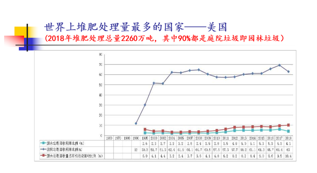 實際上,在全世界范圍內(nèi)比較,生活源、家庭源廚余垃圾及庭院垃圾(園林垃圾)堆肥利用量最大的國家是美國。美國在2018年垃圾堆肥處理總量達(dá)到2260萬噸,其中90%都是園林垃圾。