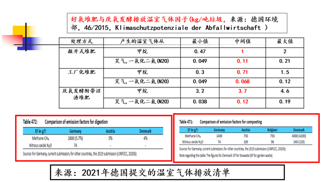 從歐盟提交給聯(lián)合國的數(shù)據(jù)來看,厭氧消化實際是增加溫室氣體的排放。歐洲的專家既然了解這個現(xiàn)實,為何還要到包括中國在內(nèi)的發(fā)展中國家來建議要做有機垃圾的厭氧或堆肥呢?其實背后也有更深層次的原因,一方面發(fā)展中國家財政實力相對較弱,難以普遍負(fù)擔(dān)高成本的垃圾焚燒發(fā)電。而另一方面在降污和減碳的雙重壓力下又切實需要減少有機垃圾的直接填埋。在這種復(fù)雜情況下,將有機垃圾分出一部分做厭氧或堆肥,實際還是能夠達(dá)到一定減排的效果。下圖中展示的是德國提交的溫室氣體排放清單中厭氧或堆肥工藝過程中,一噸有機垃圾處理排放的二氧化碳當(dāng)量。