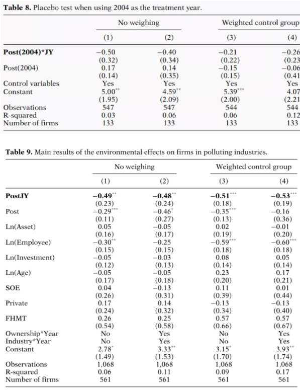 PostJY是本文最關(guān)心的變量,該變量的系數(shù)能夠刻畫江陰市綠色信貸政策的影響。表9顯示,該變量的系數(shù)負(fù)向顯著,由此可見,該政策的實(shí)施使得江陰市顯著降低了污染排放強(qiáng)度。