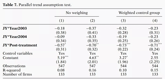 文章中的表3顯示了構(gòu)建合成江陰市的其他城市的貢獻(xiàn)權(quán)重。很明顯,常熟和吳江提供了最有用的信息,而邳州、宜興和東臺也做出了一定的貢獻(xiàn)。因此,在公司層面的分析中,作者將這五個城市中的公司作為DiD分析的對照組。