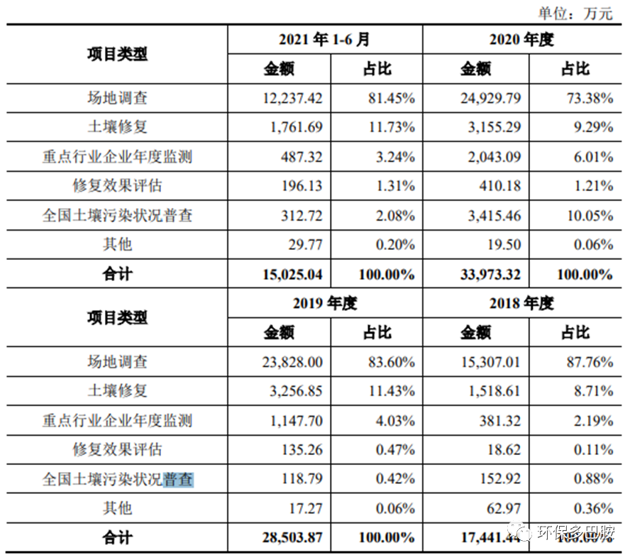“報告期各期(2018-2021H1),公司土壤和地下水檢測業(yè)務(wù)收入分別為 17,441.44 萬元、28,503.87 萬元、33,973.32 萬元、15,025.04 萬元,占公司主營業(yè)務(wù)收入的比重分 別為 98.15%、95.69%、94.73%、91.81%?!?/span>