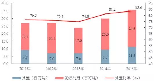 目前,我國工業(yè)危廢處理行業(yè)整體現(xiàn)狀表現(xiàn)為綜合利用水平較高,無害化水平較低,不同細(xì)分行業(yè)表現(xiàn)又有所差異。相對來說,資源化利用由于能夠回收資源價值,經(jīng)濟性較高,產(chǎn)生危廢的企業(yè)還能通過出售危廢獲得收入,因此發(fā)展較快也較為充分。而無害化處置技術(shù)復(fù)雜、處理難度高,而且對于產(chǎn)生危廢的企業(yè)帶來較大的成本負(fù)擔(dān),發(fā)展較為緩慢,甚至還有大量傾倒丟棄事件發(fā)生。根據(jù)環(huán)保局的統(tǒng)計數(shù)據(jù)顯示,2015年我國工業(yè)危廢產(chǎn)生量達(dá)到4220萬噸,同比增長16.13%;綜合利用處置率為83.6%,同比增長2.4%。