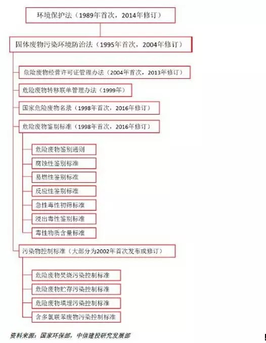 自2012年《“十二五”危險廢物污染防治規(guī)劃》發(fā)布后,國家將危廢污染防治工作作為環(huán)境保護的重點領(lǐng)域。有關(guān)危險廢物管理的法律法規(guī)和技術(shù)規(guī)范也在近幾年間陸續(xù)發(fā)布,加速推進了危廢產(chǎn)業(yè)的發(fā)展。以2004年修訂的《固體廢物污染環(huán)境防治法》為龍頭,以2007年修訂的《危險廢物經(jīng)營許可證管理辦法》和的1999年的《醫(yī)療廢物管理條例》為骨干,以2008年第二次修訂《國家危險廢物名錄》、2016年第三次修訂《國家危險廢物名錄》、2013年的《危險廢物轉(zhuǎn)移聯(lián)單管理辦法》和危險廢物鑒別、焚燒、填埋標(biāo)準(zhǔn)為枝干,我國已構(gòu)建了一系列危廢處理過程管理制度,進一步增加危險廢物處理量、減少非法處置、推動技術(shù)提升及提高危險廢物處理服務(wù)的需求。