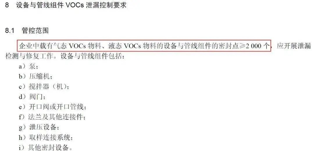 即對于企業(yè)中載有氣態(tài)VOCs物料、液態(tài)VOCs物料的設(shè)備與管線組件密封點小于2000個的,不強制開展泄露檢測與修復(fù)工作。