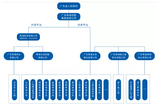 1987年,粵海集團(tuán)收購香港上市公司友聯(lián)世界的控制權(quán),并于1988年將其改名為粵海投資,粵海投資也因此成為全國駐港首家在港上市企業(yè)。其在環(huán)境領(lǐng)域主要聚焦供水領(lǐng)域,涉及原水供應(yīng)、自來水經(jīng)營、污水處理和水環(huán)境治理全產(chǎn)業(yè)鏈,提供從投資到運(yùn)營管理的綜合一體化服務(wù)。外資平臺以香港上市公司粵海投資為主體,內(nèi)資平臺以廣東粵海水務(wù)股份有限公司為主體。具體如下: