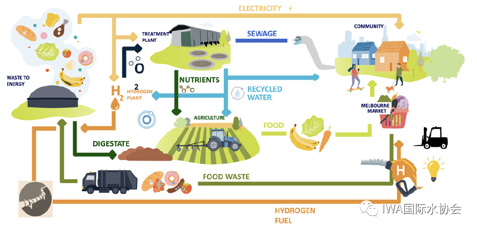 第二個(gè)例子是墨爾本的亞拉河谷水務(wù)公司(Yarra Valley Water)。他們成功召集了一個(gè)團(tuán)隊(duì)在墨爾本北郊的Aurora污水廠開(kāi)展一個(gè)制氫項(xiàng)目。該團(tuán)隊(duì)除了水務(wù)公司,還有希望實(shí)現(xiàn)碳減排的租戶、希望擴(kuò)大制氫設(shè)備規(guī)模的技術(shù)供應(yīng)商,以及尋求去碳化的供氣公司。項(xiàng)目的水源是污水廠多余的再生水,以及附近一個(gè)垃圾發(fā)電廠的剩余可再生能源。