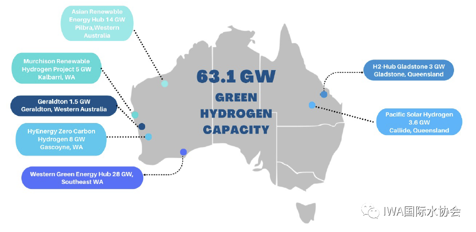 如下圖所示,澳洲計(jì)劃在東西海岸打造7個(gè)吉瓦級(jí)(GWh)的綠氫項(xiàng)目。此外,各地的污水廠已經(jīng)有實(shí)際的項(xiàng)目在測(cè)試或運(yùn)行中。