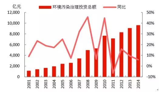 從國家統(tǒng)計(jì)局的數(shù)據(jù)可以看到,我國在環(huán)境污染治理方面的投資量,呈現(xiàn)上升趨勢,2014年達(dá)到9576億元;近年占GPD的比重維持在1.5%左右,較2001年提升約0.5個(gè)百分點(diǎn)。發(fā)改委、環(huán)保部印發(fā)《關(guān)于培育環(huán)境治理和生態(tài)保護(hù)市場主體的意見》,提出目標(biāo),“十三五”綠色環(huán)保產(chǎn)業(yè)產(chǎn)值年均增長15%以上,遠(yuǎn)高于CDP的增長目標(biāo),為經(jīng)濟(jì)增長注入動(dòng)力。