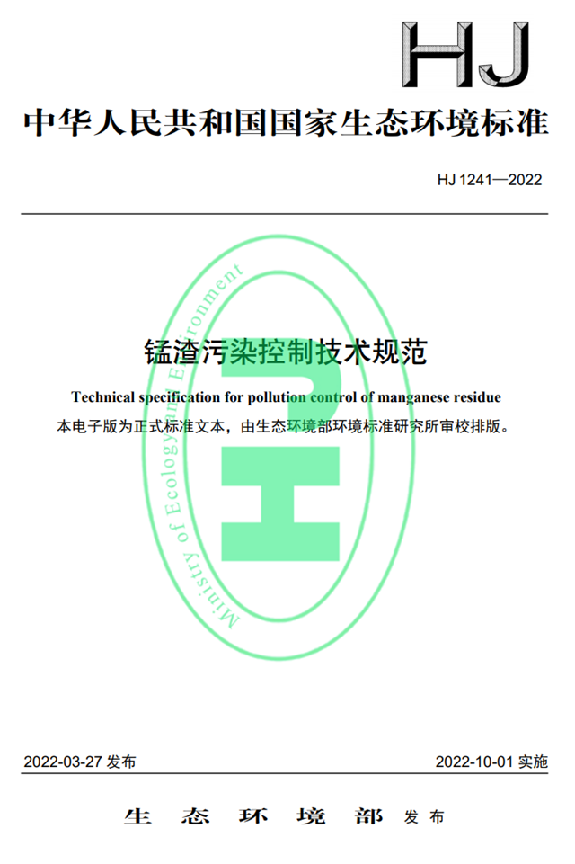 標(biāo)準(zhǔn)名稱、編號如下:《錳渣污染控制技術(shù)規(guī)范》(HJ 1241-2022)