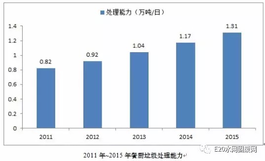 E20研究院的《餐廚垃圾處理市場(chǎng)分析報(bào)告(2016)》指出,近年來(lái)我國(guó)經(jīng)濟(jì)快速發(fā)展,餐廚垃圾以每年10%的增量不斷增長(zhǎng)。按照城鎮(zhèn)人口每人每天產(chǎn)生0.15kg餐廚垃圾計(jì)算,我國(guó)2011年的餐廚垃圾產(chǎn)生量為3782萬(wàn)噸,到2015年我國(guó)的餐廚垃圾產(chǎn)生量增長(zhǎng)到了4222萬(wàn)噸。我國(guó)餐廚垃圾處理行業(yè)也在2015年迎來(lái)了市場(chǎng)的集中爆發(fā)期。預(yù)計(jì)2016年我國(guó)餐廚垃圾的產(chǎn)生量為4347萬(wàn)噸,到“十三五”末期,我國(guó)的餐廚垃圾產(chǎn)生量將增長(zhǎng)至4873萬(wàn)噸,餐廚垃圾處理形勢(shì)嚴(yán)峻。