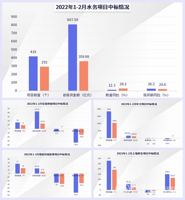 從上述圖表來看,2022年前兩個月,環(huán)衛(wèi)中標(biāo)項(xiàng)目最多,水務(wù)中標(biāo)金額最大,餐廚垃圾的同比下滑最多,土壤修復(fù)2個月的投資額同比增幅均超過了110%,1月更是達(dá)到了150.6%,而同時中標(biāo)數(shù)量卻是下降的,堪稱“完美逆襲”。