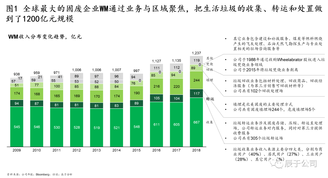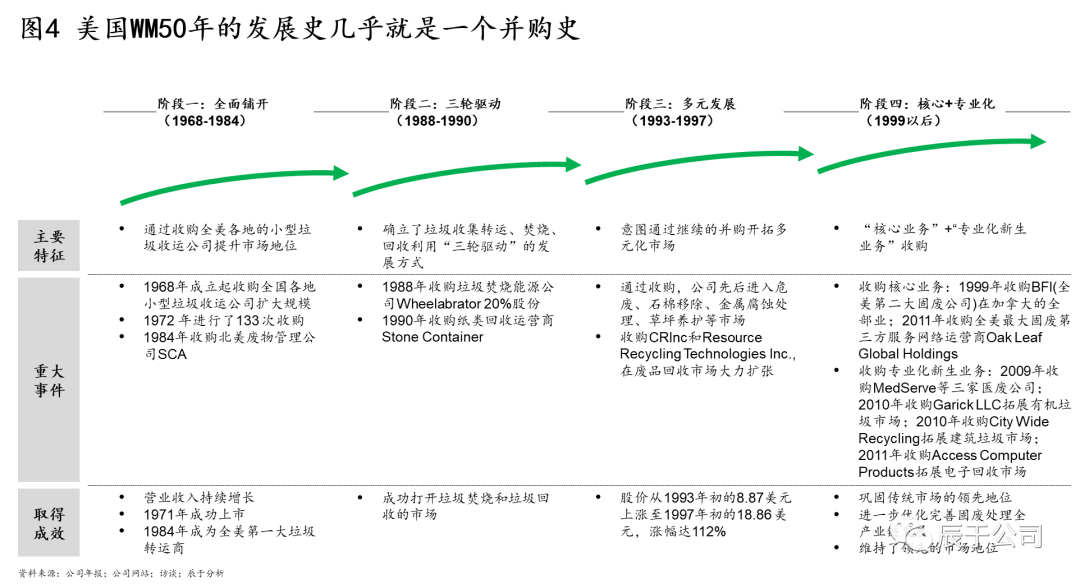 美國WM的50年發(fā)展幾乎就是一個(gè)并購史,可分為四個(gè)階段(見圖4):1968~1984年全面鋪開階段,通過收購全美各地的小型垃圾收運(yùn)公司提升市場(chǎng)地位,其中1972 年就進(jìn)行了133 次收購,1984年收購北美廢物管理公司SCA之后,成為全美第一大垃圾運(yùn)轉(zhuǎn)商;1988~1990年三輪驅(qū)動(dòng)階段,確立了垃圾收集轉(zhuǎn)運(yùn)、焚燒、回收利用“三輪驅(qū)動(dòng)”的發(fā)展方式,通過并購垃圾焚燒能源公司W(wǎng)heelabrator和紙類回收運(yùn)營(yíng)商Stone Container等手段實(shí)現(xiàn);1993~1997年多元發(fā)展階段,WM意圖通過大舉并購開拓多元化市場(chǎng),通過收購先后進(jìn)入危廢、石棉移除、金屬腐蝕處理、草坪養(yǎng)護(hù)等市場(chǎng),股價(jià)從1993年初的8.87美元上漲至1997年初的18.86 美元,漲幅達(dá)112%(不過事后證明這個(gè)階段的過度多元化并購是失敗的);1999年以后WM開始專注在核心業(yè)務(wù)+專業(yè)化新生業(yè)務(wù)的并購,其中核心業(yè)務(wù)收購了BFI(全美第二大固廢公司)在加拿大的全部業(yè)務(wù)和全美最大固廢第三方服務(wù)網(wǎng)絡(luò)運(yùn)營(yíng)商Oak Leaf Global Holdings,這些并購不僅鞏固了WM傳統(tǒng)市場(chǎng)的領(lǐng)先地 U7Y位,也完善了固廢處理全產(chǎn)業(yè)鏈布局。