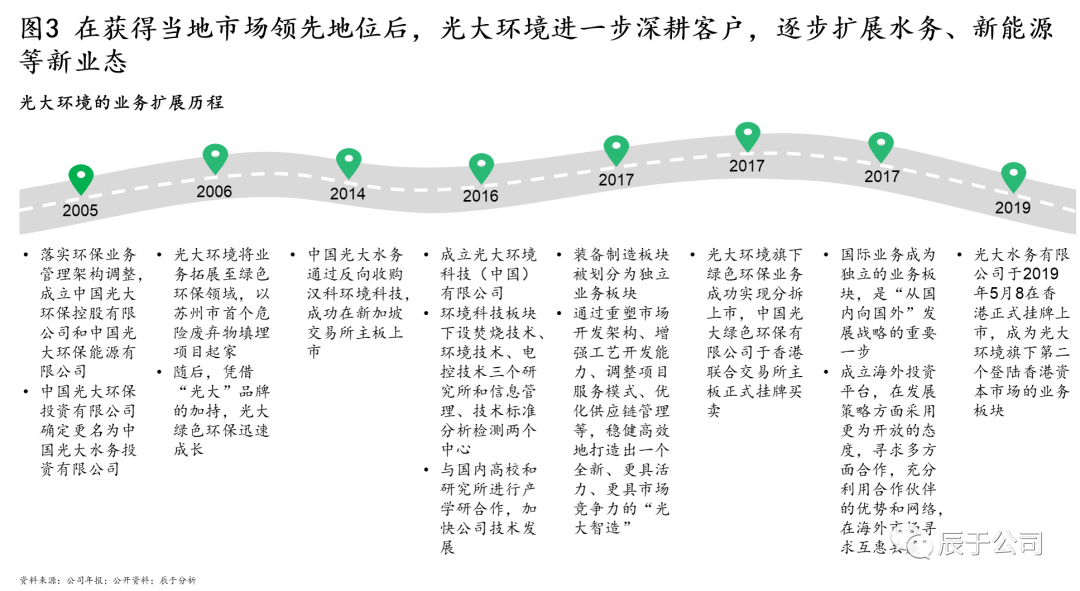 突出主業(yè)的同時(shí),辰于發(fā)現(xiàn)這些領(lǐng)先企業(yè)也特別注意多業(yè)態(tài)的協(xié)同,他們大多涉足水、固、資源/能源等多個(gè)板塊,致力于為客戶提供全方位、一攬子解決方案。成為一流的環(huán)境綜合服務(wù)商是他們的一致愿景。