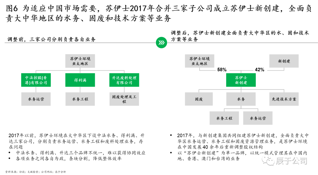 蘇伊士中國也在2017年對(duì)其組織架構(gòu)進(jìn)行了優(yōu)化。2017年以前,蘇伊士在大中華區(qū)下設(shè)中法水務(wù)、得利滿、升達(dá)三家公司,分別負(fù)責(zé)水務(wù)運(yùn)營(yíng)、水務(wù)工程和固廢廢物處理業(yè)務(wù),由于三個(gè)品牌不統(tǒng)一、難以獲得協(xié)同效應(yīng),各業(yè)務(wù)之間各自為政、條塊分割,降低了整體效率。對(duì)此,2017年蘇伊士與新創(chuàng)建集團(tuán)共同組建蘇伊士新創(chuàng)建,全面負(fù)責(zé)公司在大中華地區(qū)的水務(wù)運(yùn)營(yíng)、水務(wù)工程和固廢資源管理業(yè)務(wù),這是蘇伊士在中國發(fā)展 40 余年后重新調(diào)整股權(quán)結(jié)構(gòu),同時(shí)以“蘇伊士新創(chuàng)建”為單一品牌,以統(tǒng)一模式管理其在中國內(nèi)地、香港、澳門和臺(tái)灣的業(yè)務(wù)(見圖6)。2021年初對(duì)蘇伊士新創(chuàng)建和蘇渝兩家公司的股權(quán)收購則進(jìn)一步強(qiáng)化了組織合力。