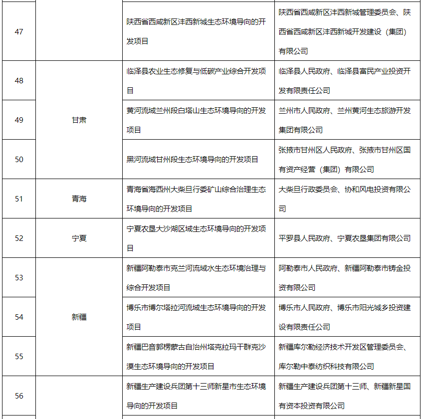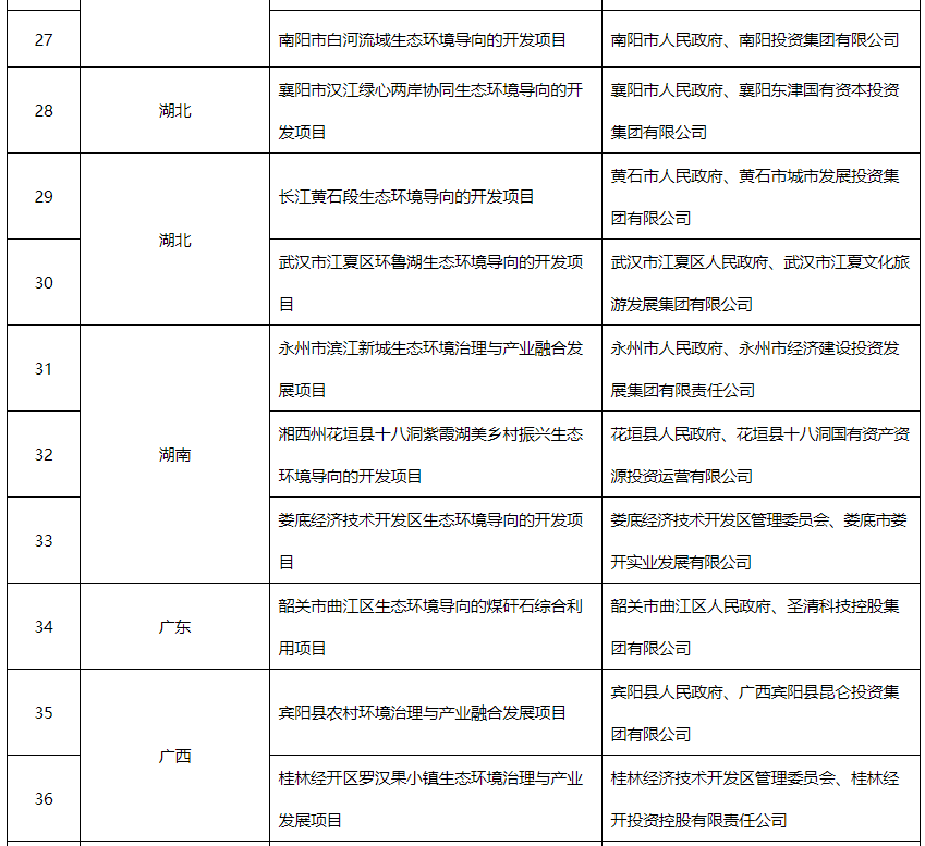 同時(shí),對于第二批試點(diǎn),3部門還提出了4點(diǎn)要求。?1、認(rèn)真貫徹國家有關(guān)生態(tài)環(huán)境治理模式創(chuàng)新和環(huán)保產(chǎn)業(yè)發(fā)展要求在試點(diǎn)工作開展過程中積極探索,創(chuàng)新生態(tài)環(huán)境治理項(xiàng)目組織實(shí)施方式,促進(jìn)生態(tài)環(huán)境高水平保護(hù)和區(qū)域經(jīng)濟(jì)高質(zhì)量發(fā)展。省級(jí)生態(tài)環(huán)境、發(fā)展改革部門等試點(diǎn)推進(jìn)單位加強(qiáng)對試點(diǎn)工作的督促指導(dǎo),對試點(diǎn)工作中發(fā)現(xiàn)的問題要及時(shí)予以糾正,推進(jìn)試點(diǎn)工作規(guī)范實(shí)施。國家開發(fā)銀行有關(guān)分行對符合條件的試點(diǎn)項(xiàng)目,按照精準(zhǔn)施策、市場化運(yùn)作和風(fēng)險(xiǎn)可控原則,發(fā)揮開發(fā)性金融大額中長期資金優(yōu)勢,統(tǒng)籌考慮經(jīng)濟(jì)效益和環(huán)境效益,在資源配置上予以傾斜,加大支持力度。也就是說,省級(jí)環(huán)保部門和發(fā)改部門要加強(qiáng)指導(dǎo)監(jiān)督,而國開行有關(guān)分行則要在資源分配上予以傾斜,加大支持。試點(diǎn)實(shí)施單位是試點(diǎn)工作的責(zé)任主體,要嚴(yán)格履行試點(diǎn)實(shí)施承諾,不以試點(diǎn)名義突破現(xiàn)有法律法規(guī)政策等要求,嚴(yán)格落實(shí)招投標(biāo)、政府采購、投融資、土地、資源開發(fā)、空間管控、資產(chǎn)處置等各項(xiàng)法規(guī)政策,不以任何形式增加地方政府隱性債務(wù)。采用合法合規(guī)方式選擇具備較強(qiáng)產(chǎn)業(yè)投資運(yùn)營能力的項(xiàng)目實(shí)施主體,由一個(gè)主體一體化實(shí)施,確保產(chǎn)業(yè)開發(fā)項(xiàng)目持續(xù)運(yùn)營。這一條,是有關(guān)風(fēng)險(xiǎn)防范的條款,告知試點(diǎn)實(shí)施單位要注意控制政府隱性債務(wù),依法開展試點(diǎn)。?3、強(qiáng)化項(xiàng)目收益內(nèi)部反哺機(jī)制試點(diǎn)實(shí)施單位切實(shí)加強(qiáng)公益性生態(tài)環(huán)境治理項(xiàng)目與相關(guān)經(jīng)營性產(chǎn)業(yè)開發(fā)項(xiàng)目一體化融合實(shí)施。在項(xiàng)目邊界范圍內(nèi)實(shí)現(xiàn)產(chǎn)業(yè)開發(fā)項(xiàng)目對生態(tài)環(huán)境治理項(xiàng)目建設(shè)與運(yùn)營的持續(xù)性收益反哺。實(shí)施中可適當(dāng)優(yōu)化試點(diǎn)依托項(xiàng)目,加強(qiáng)產(chǎn)業(yè)收益對生態(tài)環(huán)境治理的反哺力度,減少政府資金投入,力爭實(shí)現(xiàn)政府資金“零投入”。大家知道,EOD項(xiàng)目都是“肥瘦搭配”,這一條就是要求“肥”項(xiàng)目要加強(qiáng)反哺“瘦”項(xiàng)目,從而減少政府資金投入,最好是實(shí)現(xiàn)政府資金“零投入”,應(yīng)該說這才是EOD模式的“初心”。試點(diǎn)實(shí)施單位加強(qiáng)統(tǒng)籌,及時(shí)總結(jié)經(jīng)驗(yàn)做法,探索形成可復(fù)制、可推廣的生態(tài)環(huán)境治理創(chuàng)新模式。按照《關(guān)于開展生態(tài)環(huán)境導(dǎo)向的開發(fā)模式試點(diǎn)定期調(diào)度的通知》要求,試點(diǎn)實(shí)施單位于每季度首月10日前將試點(diǎn)項(xiàng)目季度實(shí)施進(jìn)度情況表報(bào)送生態(tài)環(huán)境部科技與財(cái)務(wù)司。試點(diǎn)期內(nèi)每年12月底前將年度進(jìn)展情況報(bào)告報(bào)請省級(jí)生態(tài)環(huán)境、發(fā)展改革部門審查后,由兩部門上報(bào)生態(tài)環(huán)境部、國家發(fā)展改革委,抄報(bào)國家開發(fā)銀行。既然是試點(diǎn),最重要的任務(wù)肯定就是摸索經(jīng)驗(yàn)、探索模式,從而有利于以后的推廣,這一條就是關(guān)于這方面的規(guī)定。總的來看,第二批EOD模式試點(diǎn),國家的要求并不算很多,還是以探索為主,希望能夠形成可復(fù)制、可推廣的經(jīng)驗(yàn)。所以入選項(xiàng)目也可以盡可能地放開手腳,大膽試驗(yàn)。第一批試點(diǎn)授信額度達(dá)644億元