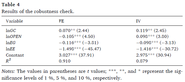為了緩解模型中存在的由變量缺失或綠色信貸測(cè)量誤差引起的內(nèi)生問(wèn)題,本研究采用綠色信貸的一階滯后項(xiàng)作為工具變量。表3中報(bào)告的工具變量法(IV)產(chǎn)生的估計(jì)結(jié)果與固定效應(yīng)模型基本一致。控制變量的系數(shù)和顯著性水平也與之前的結(jié)果一致。