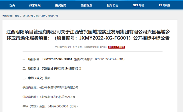 日前,江西興國縣城鄉(xiāng)環(huán)衛(wèi)市場化服務(wù)項(xiàng)目發(fā)布中標(biāo)結(jié)果公告,長沙中聯(lián)重科環(huán)境產(chǎn)業(yè)有限公司(為盈峰環(huán)境子公司),中標(biāo)(成交)金額54996萬元。