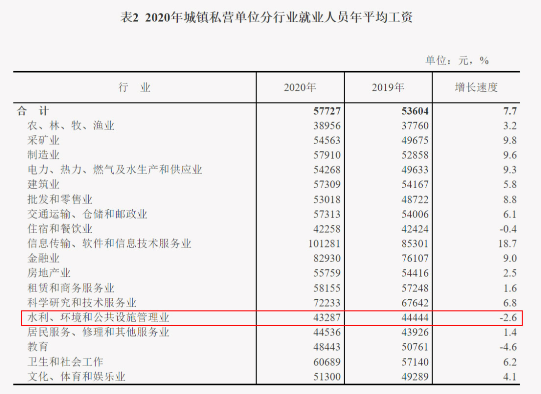 最近兩年,每到4-5月份,環(huán)保行業(yè)日子似乎都不好過。4月前后,年報(bào)發(fā)布季,一大波環(huán)保企業(yè)出現(xiàn)虧損,不好過。5月下旬,國家統(tǒng)計(jì)局照例又要發(fā)布上一年度的平均工資數(shù)據(jù),環(huán)保行業(yè)經(jīng)常排名墊底,又不好過。這不,5月20日,國家統(tǒng)計(jì)局就公布了2021年度的平均工資數(shù)據(jù),環(huán)保行業(yè)首次實(shí)現(xiàn)了收入增速的“雙墊底”(私營單位+非私營單位),增速還不如飽受疫情和政策影響的教育、餐飲和房地產(chǎn)業(yè),實(shí)在令人汗顏。而回顧過去5年,城鎮(zhèn)私營單位環(huán)保行業(yè)的收入增速就一直排名倒數(shù)。2017年倒數(shù)第一,2018年倒數(shù)第一,2019年和2020年倒數(shù)第二,2021年再次倒數(shù)第一,三次“第一”兩次“第二”(全是倒數(shù)),可謂“收入增速增長最緩慢行業(yè)”。為什么出現(xiàn)這一狀況?與環(huán)保行業(yè)的基本屬性有關(guān)。作為一個(gè)關(guān)系國計(jì)民生的重要行業(yè),環(huán)保行業(yè)注定不可能暴利,其業(yè)績的一大特點(diǎn)就是經(jīng)常“增收不增利”,從業(yè)人員的收入自然也就比較低了。5月20日,國家統(tǒng)計(jì)局公布了2021年城鎮(zhèn)單位就業(yè)人員的平均工資數(shù)據(jù)。這項(xiàng)數(shù)據(jù)主要分為3個(gè)榜單——城鎮(zhèn)非私營單位就業(yè)人員年平均工資、城鎮(zhèn)私營單位就業(yè)人員年平均工資,以及規(guī)模以上企業(yè)就業(yè)人員年平均工資。我們主要看的是前兩個(gè)榜單,非私營單位和私營單位的。榜單根據(jù)《國民經(jīng)濟(jì)行業(yè)分類》(GB/T4754-2017)對(duì)各行業(yè)進(jìn)行了分類,環(huán)保行業(yè)屬于其中的“水利、環(huán)境和公共設(shè)施管理業(yè)”。今年的數(shù)據(jù),環(huán)保行業(yè)的最大特點(diǎn)是——首次實(shí)現(xiàn)了收入增速的“雙墊底”:非私營單位收入增速,環(huán)保行業(yè)3.0%,排名倒數(shù)第一;私營單位收入增速,環(huán)保行業(yè)0.2%,排名也是倒數(shù)第一。 而橫向?qū)Ρ绕渌袠I(yè),可以看到——都比環(huán)保行業(yè)好。都說房地產(chǎn)業(yè)這兩年日子不好過,可人家的收入增速也有4.5%;都說教育業(yè)因?yàn)椤半p減”涼涼了,可以人家的增速還有8.5%;都說住宿和餐飲業(yè)受疫情影響最大,可人家的增速竟然有10.8%。你說氣人不?整天哭著喊著的行業(yè)沒啥事,這邊一直默默無聞的環(huán)保行業(yè)一算賬卻來了個(gè)墊底。為啥環(huán)保行業(yè)的收入增速這么慢?官方給出的解釋是——隨著疫情防控成效顯現(xiàn),2021年大部分行業(yè)恢復(fù)性發(fā)展,但旅游業(yè)與景區(qū)收入恢復(fù)較慢,部分地區(qū)工資水平較低的環(huán)保、護(hù)林等公益性崗位增加較多,這些都拉低了水利環(huán)境和公共設(shè)施管理業(yè)的工資增長速度。