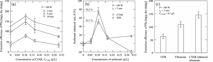 圖2 不同影響因素的提取效率。(a)不同的脈沖超聲時間下PSs的提取量與CTAB濃度之間的關(guān)系;(b)CTAB和SDS的添加濃度與表面活性劑強化比之間的關(guān)系;(c)三種方法下剩余污泥中高分子物質(zhì)的提取量(來自原文)