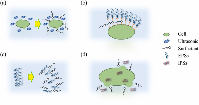 圖3 表面活性劑強化超聲波法提取的四種機理。(a)降低表面張力;(b)破壞EPSs與細胞體間的非共價鍵;(c)相似相溶作用;(d)破壞細胞壁或細胞膜結(jié)構(gòu)(來自原文)