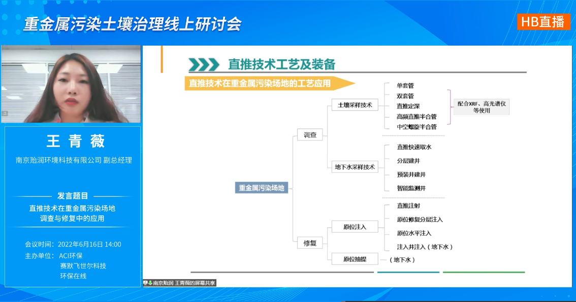 南京貽潤環(huán)境科技有限公司副總經(jīng)理王青薇介紹了直推技術(shù)在重金屬污染場地調(diào)查與修復(fù)中的應(yīng)用。王總介紹,直推技術(shù)是指通過直推式鉆機(jī)將內(nèi)附采樣器、傳感器的鉆桿通過推進(jìn)、沖擊或振動(dòng)的方式貫入地層,以快速采集代表性的土壤、土壤氣體和地下水樣品,或通過所裝備的檢測儀器獲取相關(guān)數(shù)據(jù)的技術(shù)總稱。王總介紹了南京貽潤的EP1000系列便攜式、履帶式直推鉆機(jī)、EP2000系列履帶式直推鉆機(jī)、EP4000C履帶式直推鉆機(jī)以及EP3080工作站,及其在土壤調(diào)查采樣中應(yīng)用。