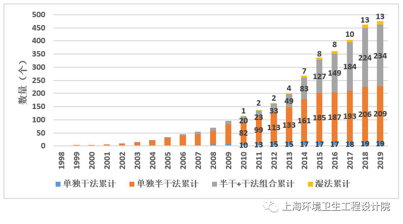 圖1 生活垃圾焚燒廠煙氣配置情況逐年統(tǒng)計(jì)圖