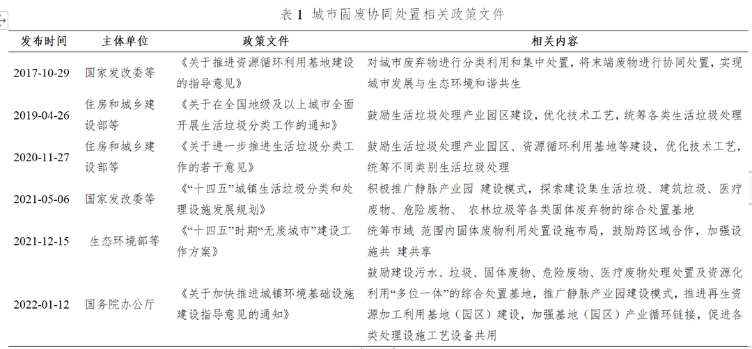 固廢協(xié)同處置園區(qū)是基于循環(huán)經(jīng)濟理念發(fā)展而來[1],是集多類固體廢棄物的綜合處置基地,以集約、高效、環(huán)保、安全為原則,發(fā)揮協(xié)同處置效應,實現(xiàn)各類處理設施工藝設備共用、資源能源共享、環(huán)境污染共治、責任風險共擔,降低“鄰避”效應和社會穩(wěn)定風險的園區(qū)。近年來,國家發(fā)改委等部門發(fā)布的政策文件多次提出建立垃圾協(xié)同處置園區(qū),具體如表1所示。
