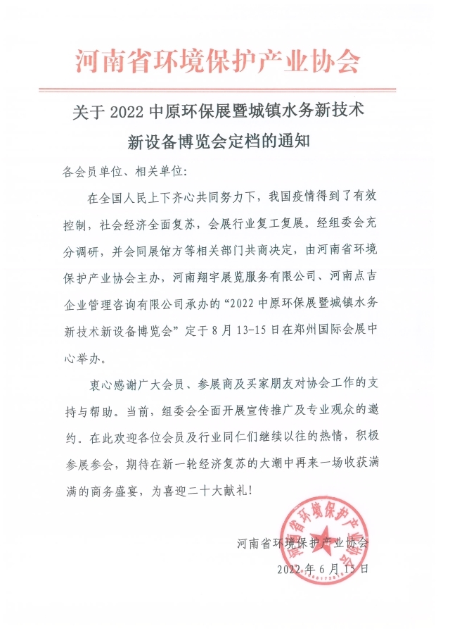 關于2022中原環(huán)保展暨城鎮(zhèn)水務新技術新設備博覽會定檔的通知