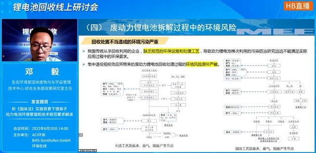 污染擔(dān)責(zé),生產(chǎn)者責(zé)任延伸,全過程監(jiān)管等新變化,鄧毅主任都一一進(jìn)行了解讀,隨后就廢動力鋰電池回收利用的背景、行業(yè)現(xiàn)狀、資源價值、拆解過程的環(huán)境風(fēng)險,《廢鋰離子動力蓄電池處理污染控制技術(shù)規(guī)范》(HJ1186-2021)等內(nèi)容進(jìn)行了梳理,同時提出了幾點建議。