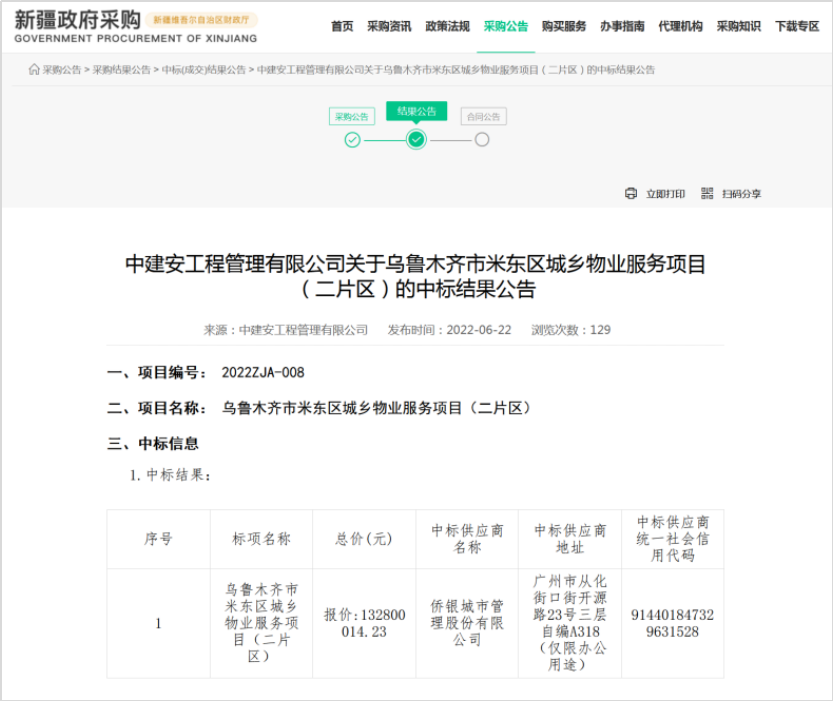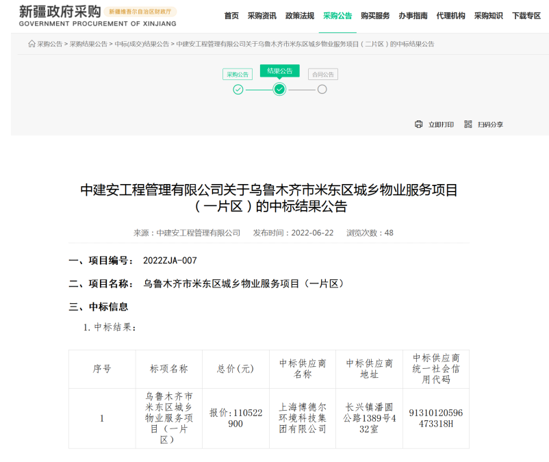 新疆政府采購網(wǎng)消息,2022年6月22日,烏魯木齊市米東區(qū)城鄉(xiāng)物業(yè)服務項目公布開標結果,兩個片區(qū)中標合同金額超過24億元,成交情況如下:
