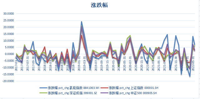 自2019年開始?xì)淠苁状伪粚懭胝撸?020年一系列政策出臺大力推行氫能發(fā)展到寫入“十四五”規(guī)劃確定氫能源的戰(zhàn)略地位,氫能指數(shù)估值也隨著政策的一步步推動穩(wěn)步上升,基本超越大盤指數(shù)(圖4),其中2021年氫能指數(shù)攀升40%,超上證指數(shù)8倍,超深證成指13倍,超中證500指數(shù)2.6倍。2022年3月底國家能源局發(fā)布《氫能產(chǎn)業(yè)發(fā)展中長期規(guī)劃(2021-2035年)》氫能指數(shù)又開始波動上升,屢屢超過中證500、上證A股等指數(shù)。這說明了市場對利好信息的反應(yīng),資本市場對利好政策的敏感。