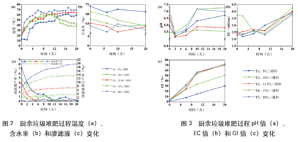 整體看來,各處理含水率呈不斷下降趨勢,而其他各處理含水率均低于5%三輔料處理(圖2b)。到堆肥結束時,添加12.5%和20%三輔料的處理含水率最低,分別為62.62%和61.54%;5%三輔料處理含水率為68.97%。堆肥開始時,隨著輔料配比的升高,滲濾液產率逐漸降低,5%三輔料和20%三輔料處理差異顯著,初始產率分別為7.2%和0.1%(圖2c)。當輔料添加比例由5%增至12.5%時,滲濾液累計產率由19.7%降至7.2%;當輔料添加比例增至20%時,滲濾液累計產率為1.0%。由此可見,當輔料施用比例大于12.5%時,可以顯著減少由廚余垃圾的高含水率產生的大量滲濾液。
