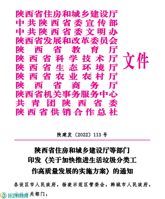 陜西省住房和城鄉(xiāng)建設(shè)廳等部門(mén)印發(fā)《關(guān)于加快推進(jìn)生活垃圾分類工作高質(zhì)量發(fā)展的實(shí)施方案》的通知