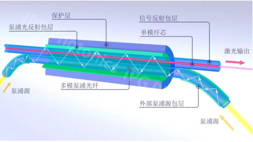 包層側(cè)泵浦技術(shù),由多模泵浦光纖和單模摻雜芯光纖組成雙光纖結(jié)構(gòu),將多模二極管光轉(zhuǎn)換成單模光纖激光器,具有極高的效率和高亮度。相比其他光纖激光器普遍使用端面泵浦而言,具有更高的效率和光束質(zhì)量(因?yàn)槎嗣姹猛ǔP枰褂梅瓷溏R,并且可能需要在激光器內(nèi)保持正氣壓,以避免灰塵和其他污染物)。