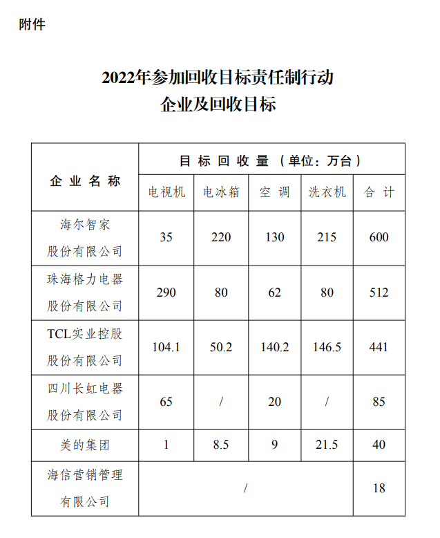 2022年5月,國(guó)家發(fā)展改革委辦公廳、工業(yè)和信息化部辦公廳、生態(tài)環(huán)境部辦公廳印發(fā)《關(guān)于做好2022年家電生產(chǎn)企業(yè)回收目標(biāo)責(zé)任制行動(dòng)有關(guān)工作的通知》,確定了6家開(kāi)展2022年回收目標(biāo)責(zé)任制行動(dòng)的企業(yè)(見(jiàn)附件)。