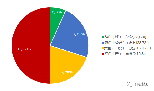 30個城市平均分26.0分,中位數(shù)得分17.8分。垃圾分類等級為好的城市2個,較好的城市8個,共占33%,差的城市有15個,占50%,垃圾分類表現(xiàn)總體處于低水平。