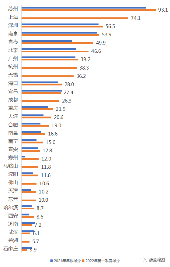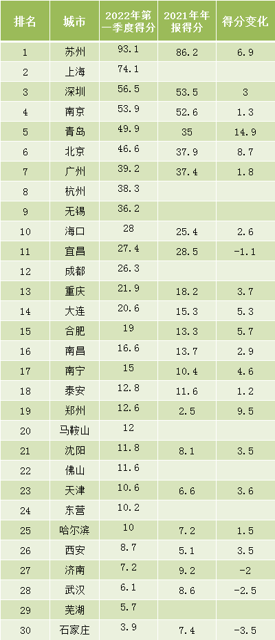 蘇州市百尺竿頭更進一步,以93.1的高分繼續(xù)保持領先;本季度新納入評價的上海市74.1分,位居第二。哈爾濱、濟南、武漢、蕪湖、石家莊得分低于10分。